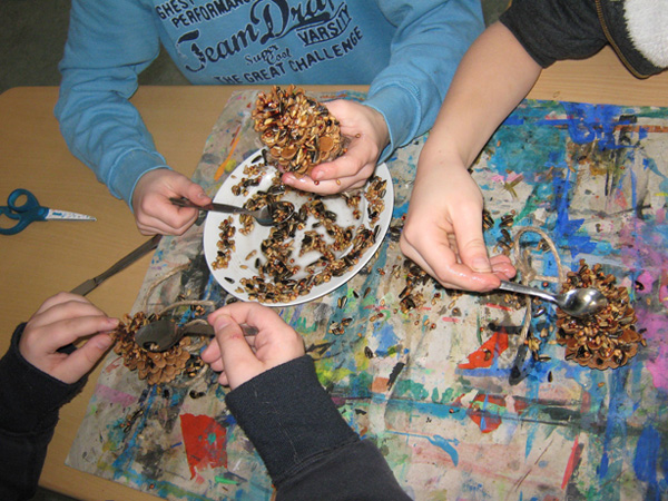 So stellten die Schülerinnen und Schüler der Natur-AG mit ihrer Lehrerin aus Kokosfett und einer Körnermischung zahlreiche Futterzapfen her, die sie nun nach und nach in die Sträucher und Bäume des Schulgeländes hängen.